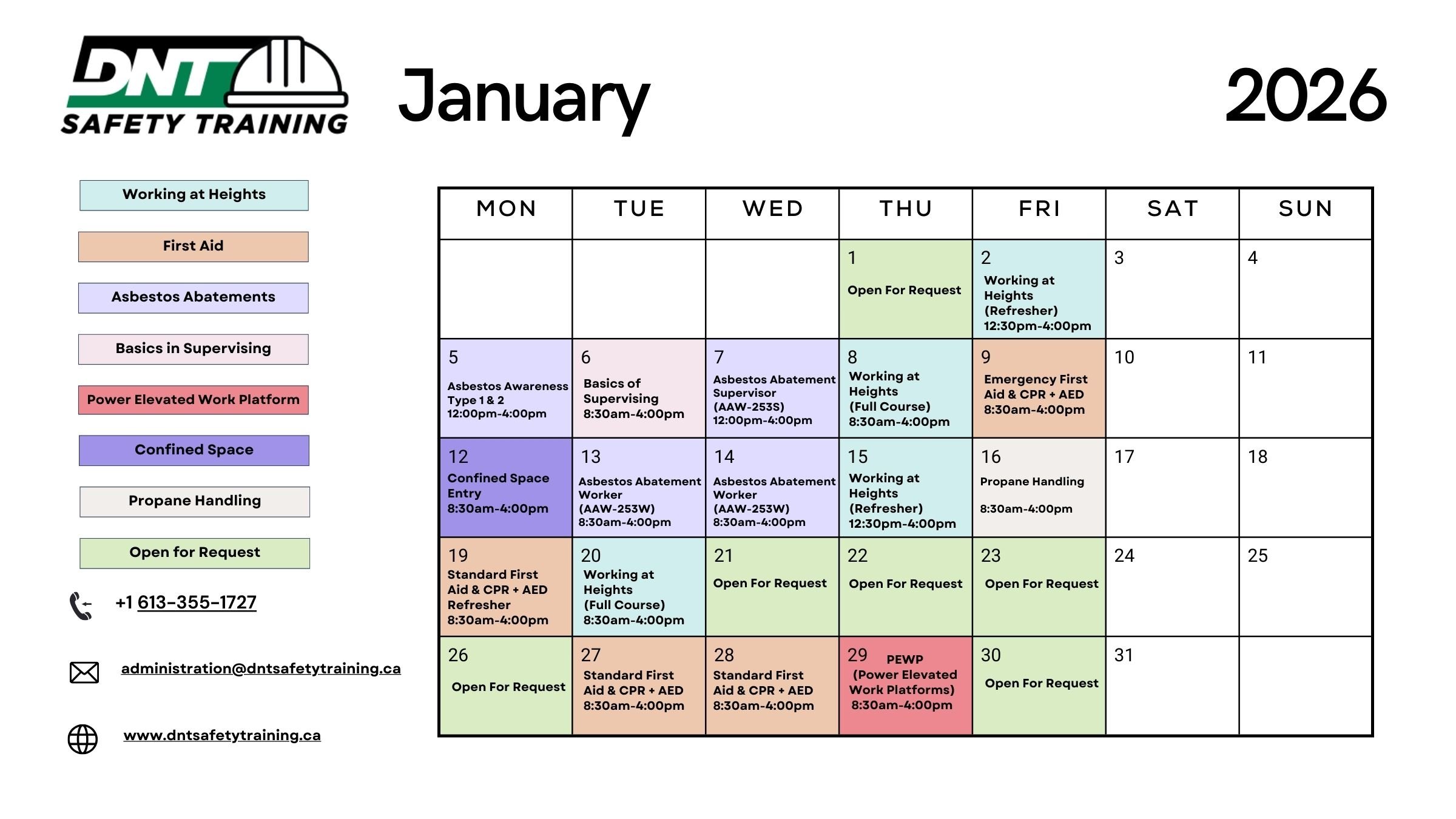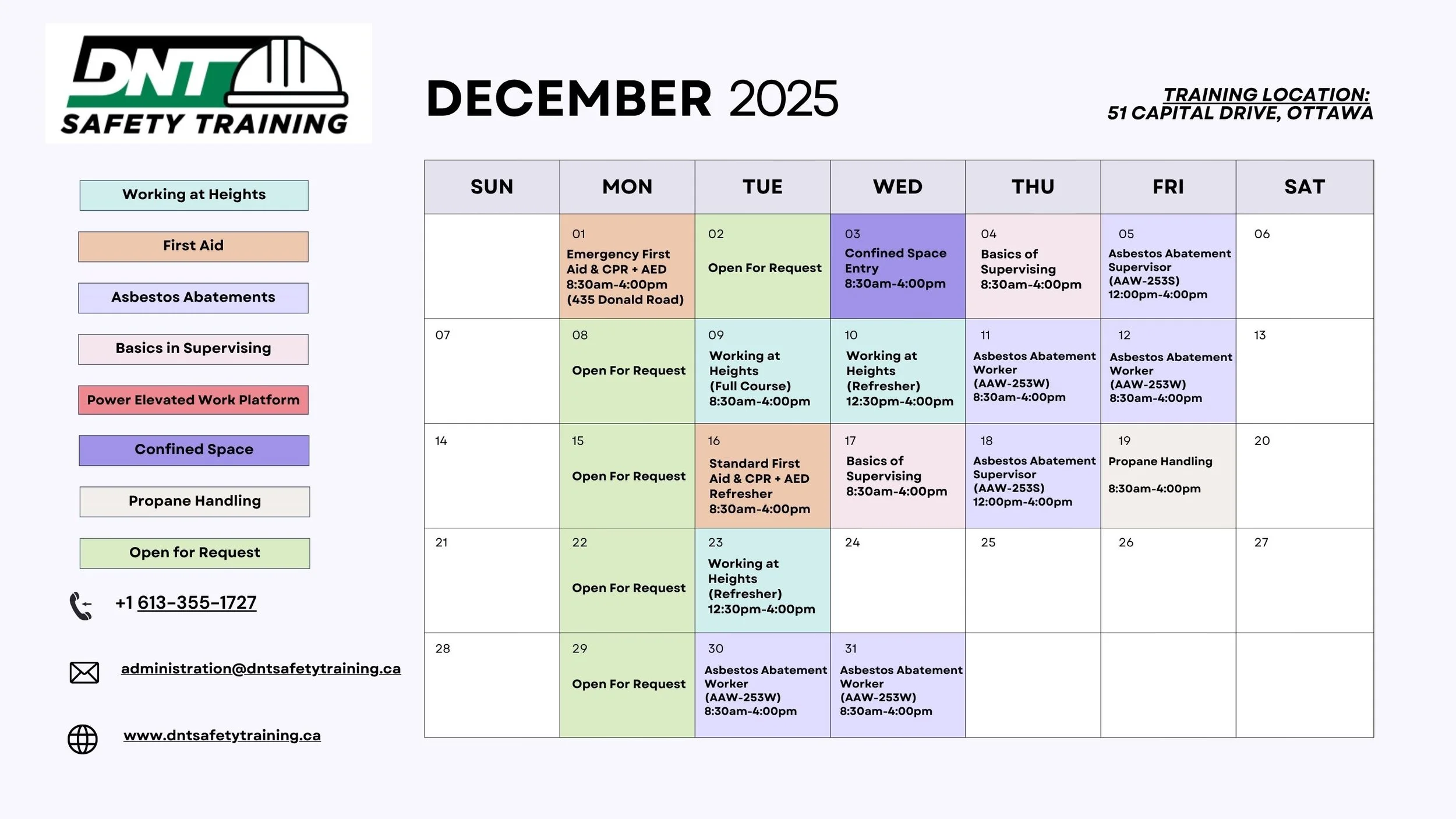 DNT Safety Training is proudly based in the Ottawa region, providing high-quality safety training for businesses across the area. In addition to serving the Ottawa district, our instructors travel throughout Ontario to deliver on-site safety training directly at your workplace. This gives companies the flexibility to train their teams without disrupting daily operations. Whether you need Ottawa safety training or mobile workplace safety services anywhere in Ontario, DNT Safety Training brings expert instruction right to you.
